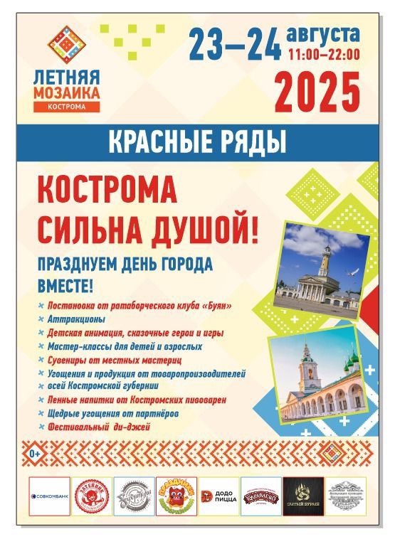 В это же время на проспекте Мира начнет свою работу интерактивная праздничная площадка «Костромской Арбат», включающая трансляцию лучших практик по патриотическому воспитанию детских садов «Город детства», фестиваль библиотек «Любимый сердцем город», поэтический марафон «СтихиЯ Костромы», детскую площадку «Загадки Костромы», мастер-классы и фотозоны. Гостей праздника будет встречать главная волшебница – Российская Снегурочка.