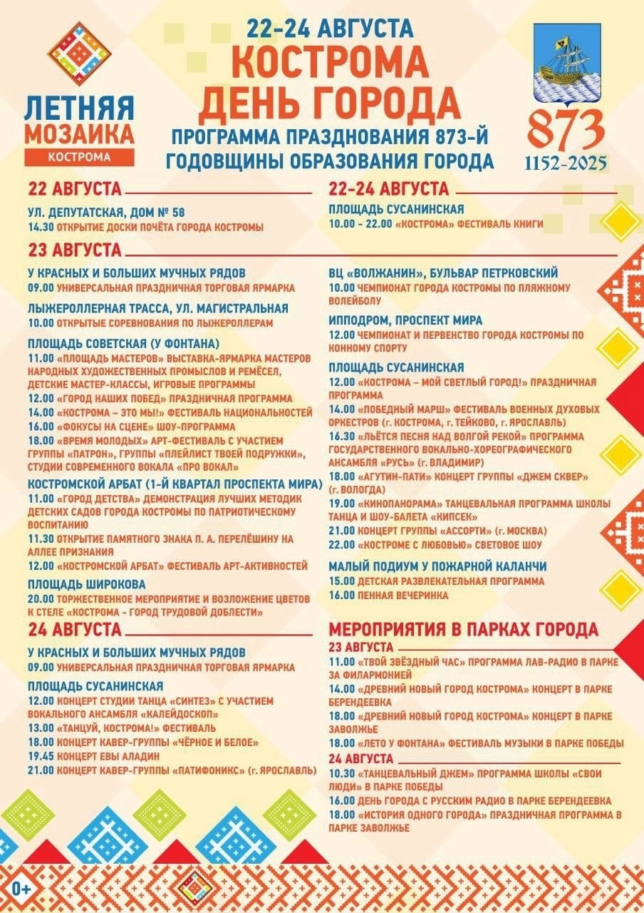 Кострома готовится отметить 873 года с момента основания города. По информации управления культуры администрации города Костромы, основные праздничные торжества пройдут 23 и 24 августа. В программу праздника включены десятки спортивных, культурных, творческих мероприятий, которые состоятся на разных площадках города и пройдут под единым слоганом «Кострома - мой светлый город!»