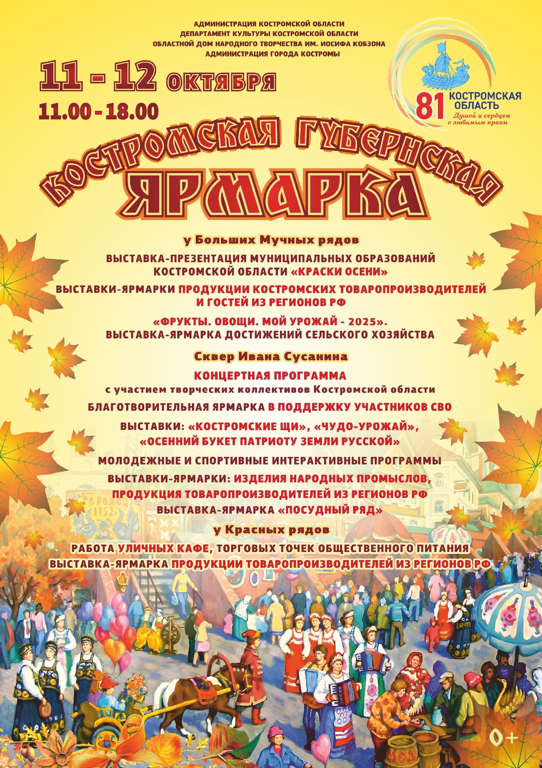 Праздник осеннего урожая! Концертная программа с участием лучших творческих коллективов Костромской области, интерактивные программы и мастер-классы, спортивные состязания, конкурсы, выставка-ярмарка продукции костромских товаропроизводителей и гостей из регионов РФ.