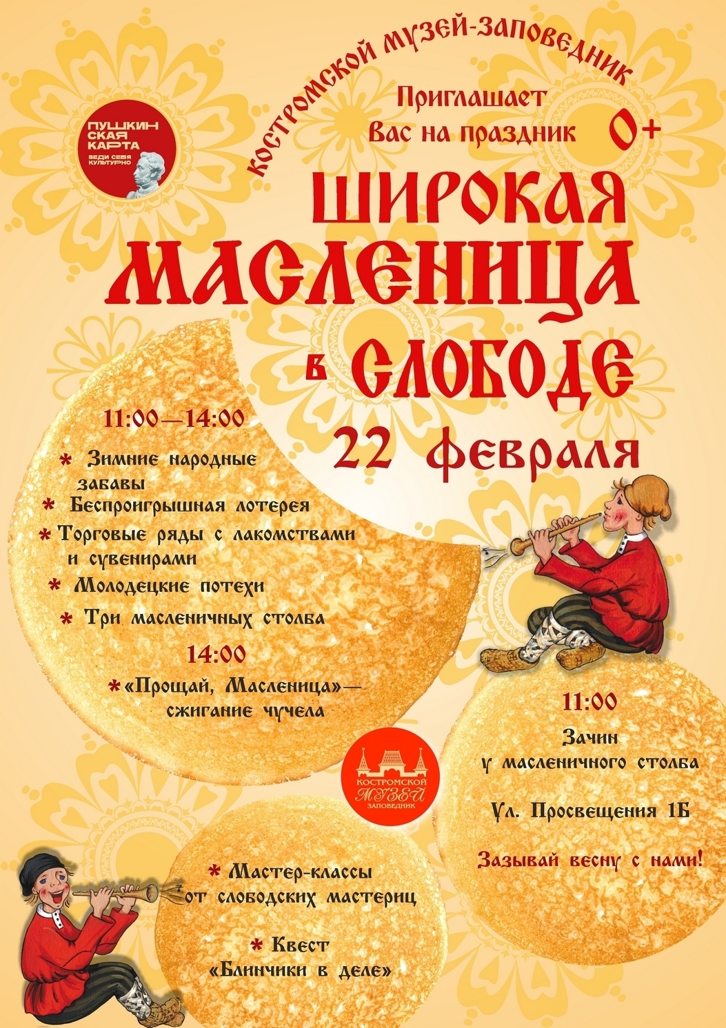 22 февраля в 13.00 команда Костромского фонарщика приглашает всех желающих на празднование Масленицы. В программе: экскурсия с гидом по исторической части города, чаепитие с блинами, а также настоящее сырное казино и дегустация лучших костромских, российских и зарубежных сыров.