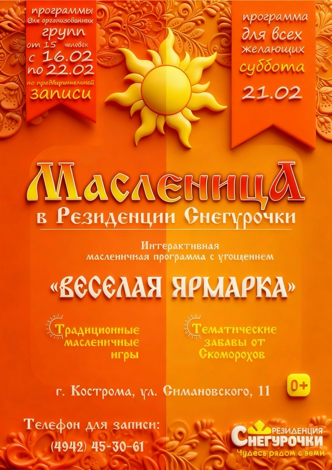 Интерактивная программа «Весёлая ярмарка», где гостей встретят скоморохи, интересные русские традиции и румяные блины по фирменному рецепту! Подробнее о мероприятии