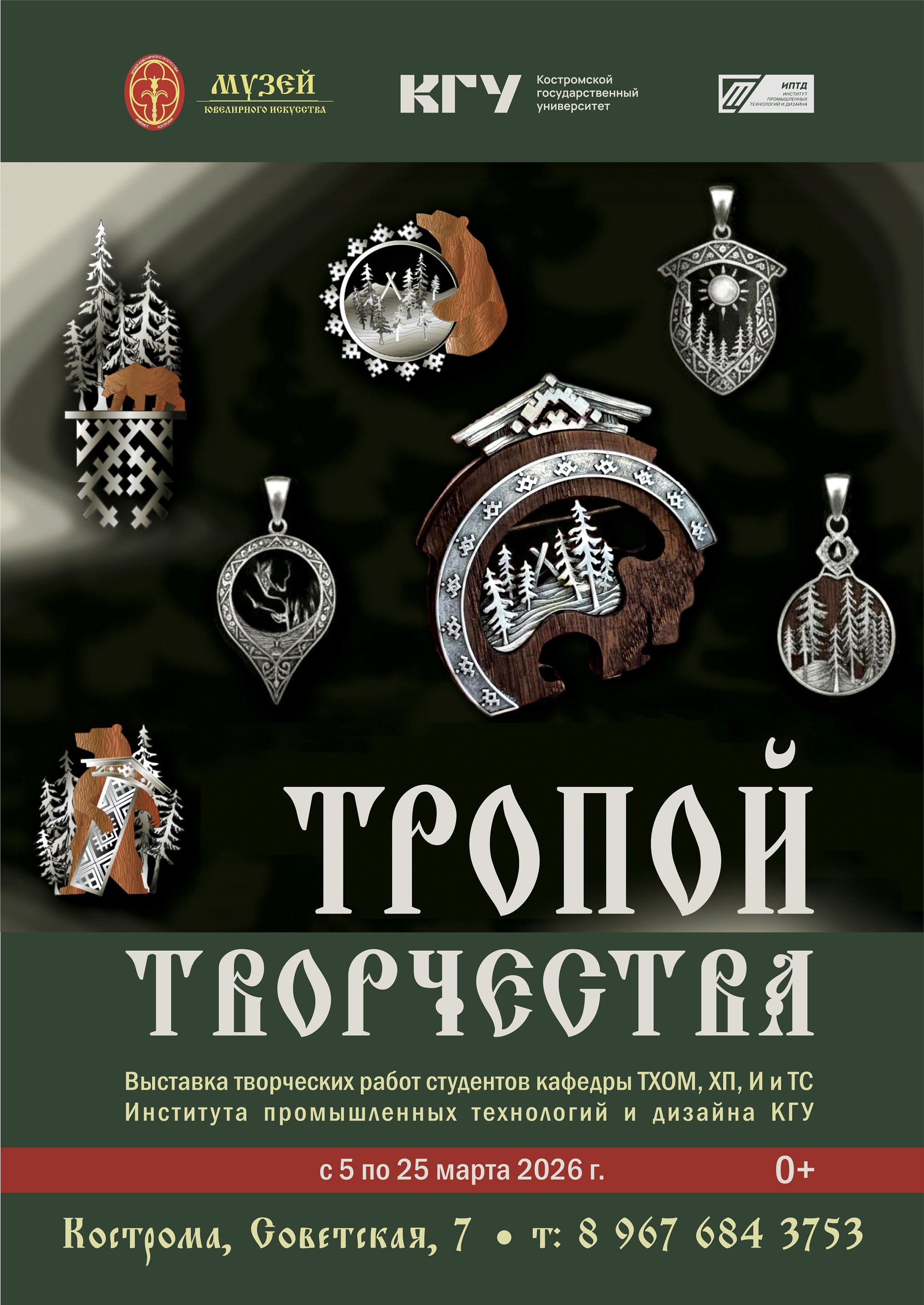 Кафедра технологии художественной обработки материалов, художественного проектирования, искусств и технического сервиса Костромского государственного университета более 30 лет выпускает технологов и художников ювелирного производства. Лучшие дипломные и творческие работы, выполненные студентами, представлены вниманию зрителей на этой выставке. Цель этой экспозиции – подарить зрителям возможность увидеть проекты молодых художников, проникнуть на территорию творческой мастерской. Хотелось открыть завесу отделяющую производство от зрителя, который видит готовое изделие на выставке или прилавке магазина. Показать путь исследований и размышлений пройденный для реализации творческих задач.