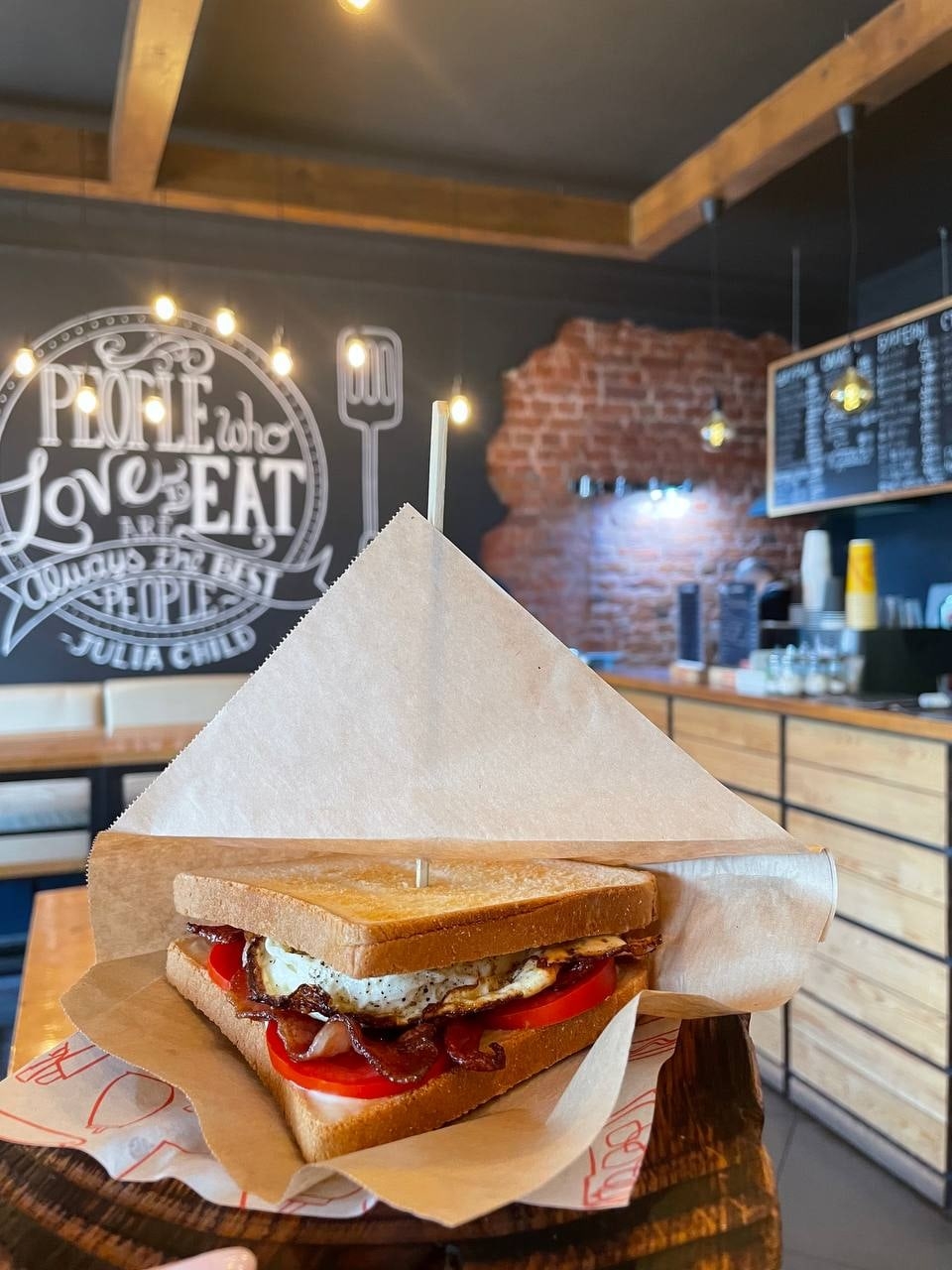 Разнообразная уличная еда в уютном кафе: шаурма, бургеры, кофе, морсы.